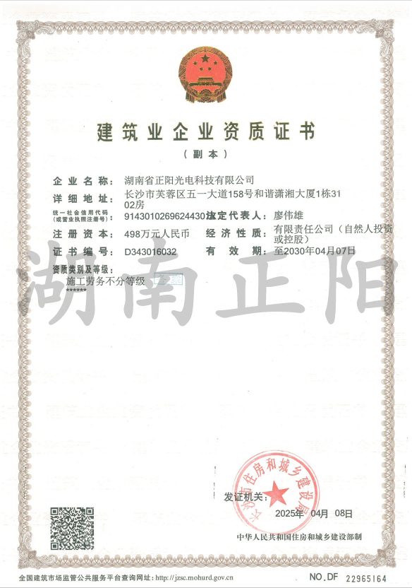 2025年4月8日,經(jīng)長沙市住房和城鄉(xiāng)建設(shè)局審核批準,湖南省正陽光電科技有限公司成功獲得“施工勞務”資...